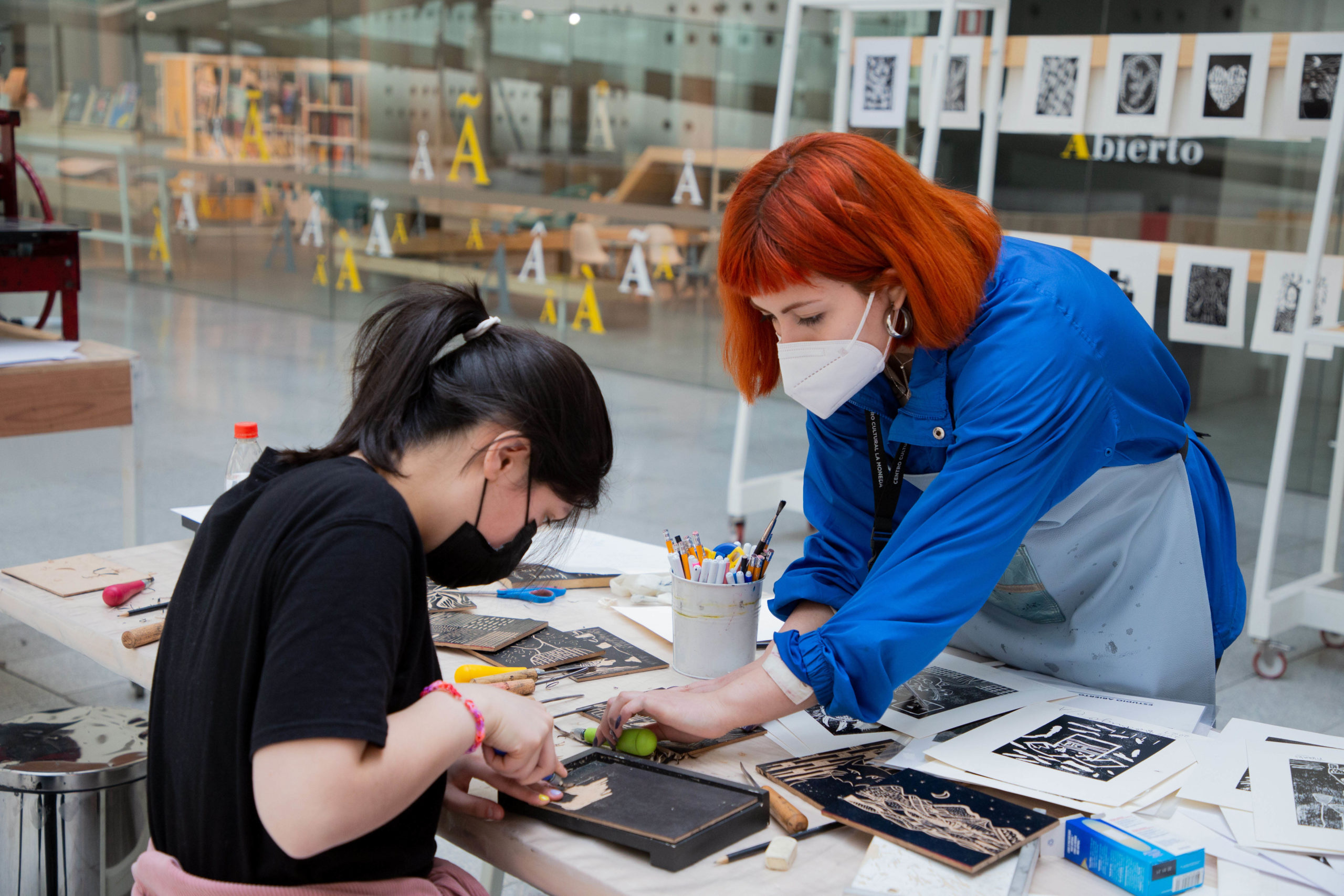 - Estudios abiertos de xilografía, moldeado en greda, vaciado en yeso, edición de imágenes (collage) y confección con patrones | 10:00, 12:15 y 15:15 horas